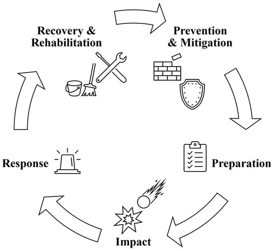 Measures vary according to each stage of the disaster risk reduction (DRR) management cycle. In the context of this work and considering CI as a thematic background, five stages of the DRR cycle are defined, in accordance with the studies conducted by [,]. These stages define time periods in the progression of actions necessary after a disaster event or, as defined here, impact. The next stage is defined as response, describing the actions or strategies that respond and adapt immediately to the adverse impacts of an event. Subsequently, the stage of recovery and rehabilitation is highlighted, focusing on returning CI services to acceptable and constant conditions for end users and chain partners. The stage of prevention and mitigation progresses to increase resistance, adapt to the impact, or avert it in other ways. The final stage before closing the DRR management cycle describes the preparation during which all measures are taken in the immediate anticipation of an event (cf. Figure 1). Further, all measures in the DRR management cycle for flooding are referred to as flood measures.