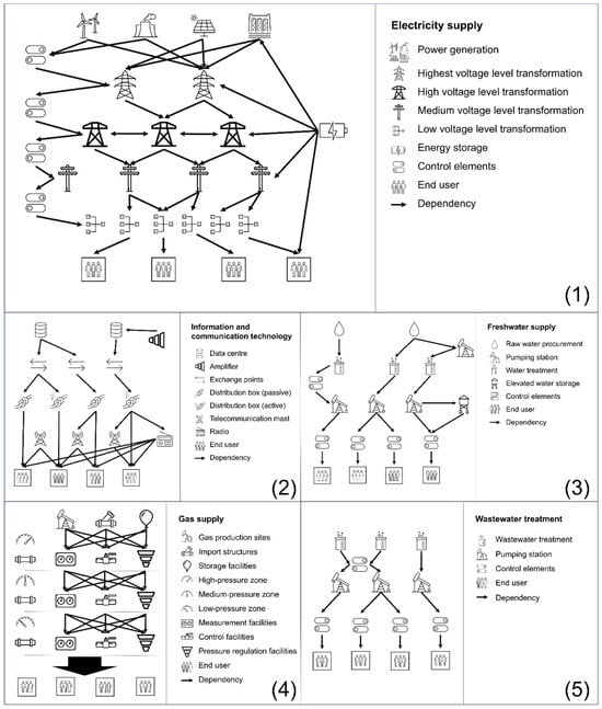 Hierarchy of network elements for electricity supply (1), information and communication technology (2), freshwater supply (3), gas supply (4), and wastewater treatment (5).