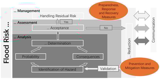 Flood risk management is grounded in a comprehensive flood risk analysis (FRA) as visualized in Figure 3. This analysis consists of identifying flood-prone areas and combining probabilities for recurrence intervals or failure probabilities with the potential consequences of flooding. The FRA uses these values to determine the flood risk for the current situation. The decision to accept or reject the current flood risk necessitates identifying appropriate types of measures along the DRR management cycle (cf. Figure 1). As described in the previous section, these measures were identified in this manuscript through a participatory approach. The FRA describing the current situation is then also used to test the effectiveness of various flood measures.