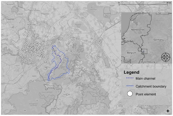 The case study area was chosen along a river body that had significant impacts during flooding events in Western Europe in 2021. Comparable studies used the flooding in 2021 as a benchmark for what-if analyses, such as []. At the same time, the catchment offers a testing ground of a relatively small size and is thus comprehendible. The combination of recent flooding and good news coverage, in combination with a small catchment area, allows for good checks of plausibility. Additionally, a quality check of the availability of OSM data coverage showed good results []. The electricity and telecommunications sectors were represented by a sufficient number and type of point elements to form a hierarchical system.