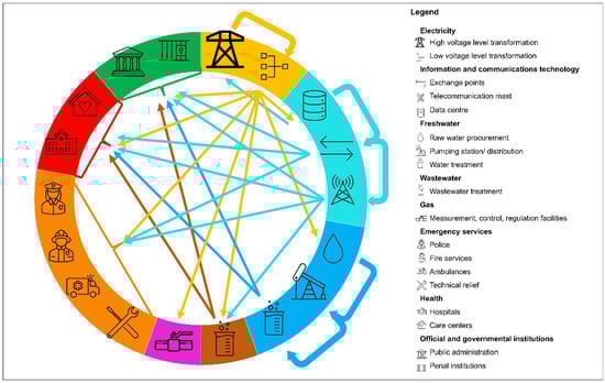 In the present study, the focus is on sectors with a high level of physical and logical interdependencies, such as electricity, ICT, freshwater supply, sewage water treatment, and gas supply. These are referred to as primary sectors because of their high potential to disrupt other sectors. Secondary sectors, which are defined by their characteristics of mostly relying on incoming physical and logistical dependencies and severity for the civil population, are excluded (e.g., health or public administration). Additionally, the transportation sector and linear structures of the previously highlighted sectors, such as pipes, cables, and road networks, were not specifically considered.