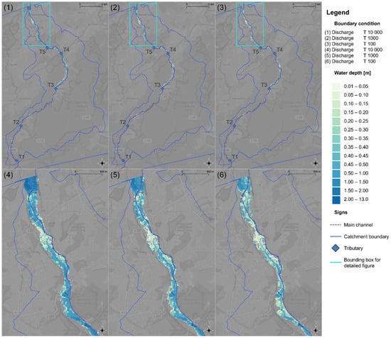 Another component for the flood risk analysis is the hydraulic model, which consists of a 1D part for the Vicht main channel and 2D rasters covering the entire catchment. The purpose of the hydraulic model is to derive inundations and velocity 2D information and superpose them with the CI network. The results of the hydraulic model additionally allow the assessment of the time course of a flood event. As an input for the hydraulic model, a digital elevation model with 10 m resolution is used. The 1D river model consists of 99 profiles with a width of 50 m and a distance of ~230 m in between profiles. For the hydraulic boundary, a synthetic discharge was used as a T100 event, and based on a logarithmic distribution, T1000 and T10,000 discharges are derived (cf. Table 4). No measurements were used to derive the hydraulic boundary since the differentiation from fluvial and pluvial effects of historic events was not possible. Therefore, the hydraulic boundary and the return periods are not the most reliable because a long set of measurements is necessary in order to derive reliable return periods. However, the purpose of this proof-of-concept is not to derive the most accurate values for return periods but to show the risk-based approach of CI analysis and measure planning by calculating water depths associated with different probabilities of occurrences (cf. Table 4). Therefore, a wide range of return periods is essential. The hydraulic model uses discharges as boundary conditions, which were added to the main channel of the Vicht in five tributary inflows (cf. Figure 6 (1–3)). A detailed view of the city of Stolberg shows the inundated areas in Figure 6 (4–6). The values of the discharge boundary conditions for each tributary are listed in Table 4.