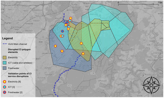 Owing to the limited availability of integrated datasets for validation, only anecdotal validation for the model results is executed. Posts in a Stolberg-focused social media group were analyzed during the flooding in July 2021 []. The hydraulic boundary does not fit the flooding in 2021 but can give an impression of the sectors that are involved. Posts that commented on a disrupted CI service and a specific location are shown in Figure 8 as validation points. Most posts were concentrated in the three CI sectors previously mentioned. The comparison with the model results confirms the accuracy of the modeling results in seven of 13 validation points. However, the validation can only confirm that a disruption occurred, and not the duration of the disruption.