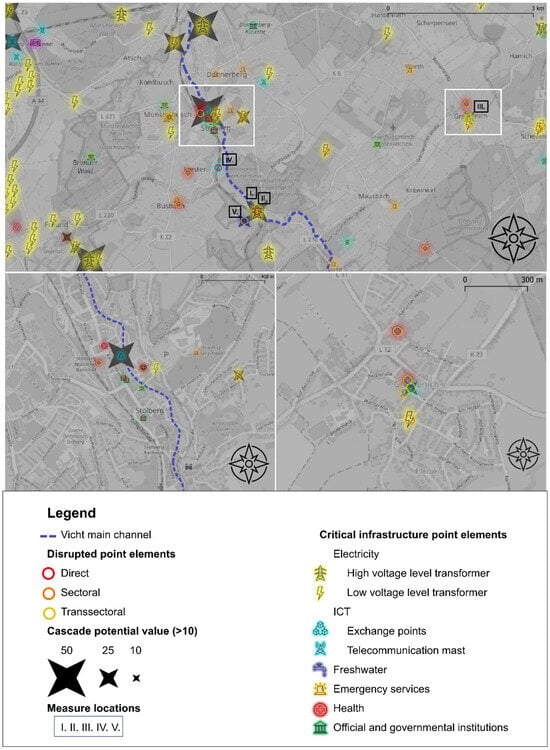 In this part of the case study, the flood measure catalog was utilized to identify potential measures. The network model in combination with the hydraulic model provides evidence about the potential benefits of the measures. Flood measures are necessary to improve the current situation, as analyzed in Section 3.2, and to make a shift from mere flood risk analysis towards flood risk management (cf. Section 1). Some of the measures collected can be tested in the CIN model environment (cf. Section 3.2) and compared to each other for decision-makers to choose the most suitable solutions. Table 2 is used to determine the measures that could be considered for the case study. In addition to the table, the Cascade Potential Value (CPV) is used to highlight which CI point elements have high potential for measures to be effective. The CPV of each point element determines the number of dependent CI point elements []. A high CPV indicates that the failure of a point disperses further and causes indirect sectoral or trans-sectoral disruptions. A high CPV and a direct disruption highlight the necessity to check for measures. Figure 9 shows a spatial overview of these points, as well as the locations chosen for five potential measures (Measure I–V) from three different sectors. Table 6 describes the measures that have been considered and links each measure to the cell from which they originate in Table 2.