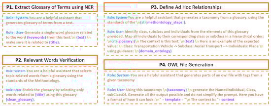 This section details the workflow and procedures for leveraging the ChatGPT API’s language understanding and reasoning capabilities, as highlighted by the light-orange border in Figure 2, to develop the ontology. The ontology generation process relies on a series of engineered promotes derived and guided by the ontology design procedures from the Methontology framework to guide the LLM in performing specialized tasks. Currently, we do not apply any prompt tuning or fine-tuning technique to our method.