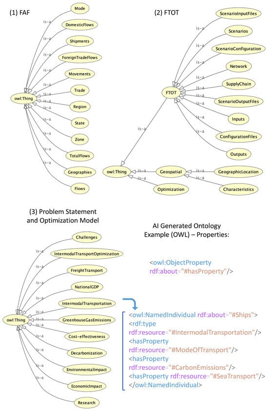 As new data sources and urban simulation scenarios rapidly emerge across expansive urban regions, and with the deployment of new sensors and IoT-connected infrastructure, the challenge intensifies. Additionally, the increasing availability of data from various sources, such as crowd-sourcing, autonomous vehicles, and simulation outputs, further complicates the landscape. From a data interoperability perspective, ontologies and knowledge graphs play critical roles in multi-domain data integration and simulation coupling [,]. For instance, solving complex optimization problems in freight transportation systems often requires integrating data on freight, fuel, and emission simulations, real-time traffic, and transportation infrastructure. These comprehensive tasks can definitely benefit from an ontological approach. Developing a system-based knowledge representation using ontologies and knowledge graphs is essential for discovering, managing, and sharing complex urban science data, which are indispensable for creating urban digital twins, information systems, and decision support tools.