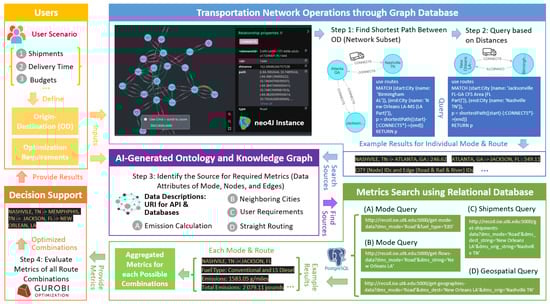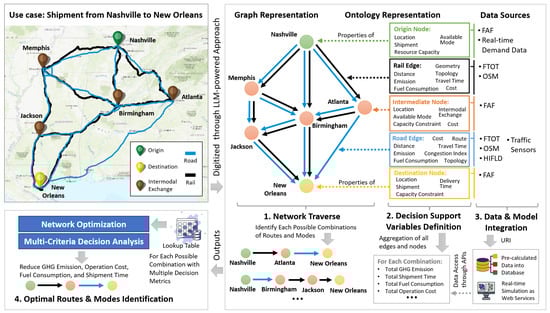 Despite the successes of past smart city applications, challenges persist in optimizing complex urban systems, which involve intricate interactions among various subsystems []. A prime example is the intermodal freight transportation system, spanning vast areas and governed by dynamic, multi-scale processes with broad socioeconomic and environmental impacts []. Developing holistic solutions to optimize such a system often requires in-depth domain expertise and laborious efforts to conceptualize the problem, formulate decision support strategies, identify relevant data sources and variables that represent essential processes and dynamics, and create a comprehensive data provisioning system (e.g., database and repository) through the integration of diverse urban data and coupled simulation outputs across multiple domains. These data provisioning systems are crucial for providing information to analytical and optimization models, as well as decision support workflows, to generate both model and data-driven insights essential for informed decision-making in urban digital twins and decision support systems.
