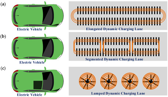 Estimating the charging demand of EVs using wireless charging technology would involve analyzing factors such as the count of EVs on the lane, the driving patterns of EV users, the charging capacity of the wireless charging infrastructure, and the availability and accessibility of the charging infrastructure. One approach to estimating charging demand is to use data from existing EVs and their charging behaviors [41]. These data can be used to estimate the average distance driven per day, the average time spent driving, and the average charging requirements of EVs. This information can then be used to estimate the number of charging stations and the capacity of the wireless charging set-up needed to meet the demand. Another approach is to use simulation models to estimate charging demand. These models can take into account factors such as EV adoption rates, the availability of the wireless charging infrastructure, and the impact of various policies and incentives on EV charging behavior [42]. Overall, accurately estimating the charging demand of EVs using wireless charging technology would require a comprehensive understanding of the various factors that influence EV charging behavior and the development of appropriate modelling tools and data sources to estimate charging demand. Elongated tracks (more than 10 m) serve as transmitter pads in a DWPT framework in Figure 2a to charge EVs while they are moving [43]. Another DWPT construction with numerous lumped pads inserted in the pavement is shown in Figure 2b [44]. In order to combine the advantages (and disadvantages) of the two previously mentioned layouts, elongated pads, which are depicted in Figure 2c, are broader than combined pads but shorter compared to long rails.