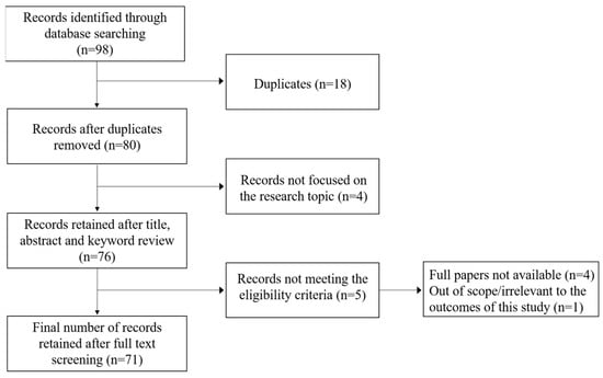 Following the described steps, a total of 98 references were identified from the Scopus and Web of Science databases. After removing 18 duplicates, 80 documents underwent individual screening based on their titles, abstracts, and keywords. Four papers were excluded because they focused on cities in Abu Dhabi, Iraq, South Korea, and Venezuela, which were not within the scope of this study. Thus, 76 records underwent eligibility assessment through full-text screening. Of these, four papers could not be retrieved due to lack of full access, while another paper was excluded after full-text screening because its content was deemed irrelevant or out of scope for the objectives of this review. As a result, a total of 71 records were eligible for inclusion in this review.