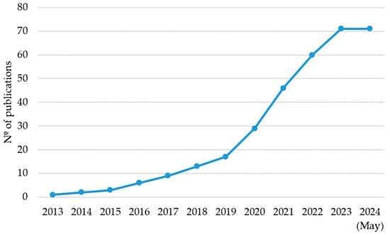 The 71 eligible papers were published between 2013 and 2023. As depicted in Figure 2, the topic has garnered increasing attention in recent years, with 59% of the documents published in the last four years. All retrieved documents were published as articles in a total of 49 journals spanning various subject areas. The journals with the most publications included Sustainability (10 publications), Sustainable Cities and Society (4), Cities (3), IEEE Access (3), Journal of Urban Technology (3), and Sensors (3).