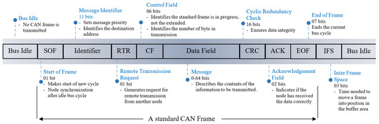 In addition, an on-board diagnostic port is also part of the CAN-bus system, which allows interfacing between external devices and ECUs via CAN-bus. Communication through CAN-bus employs the multi-master concept, i.e., any ECU in the network can take control of the bus, send message and request data from any other electronic control unit in the vehicle. In short, it is a message-oriented communication protocol with a data length of eight bytes and an up to 1 Mbps bit rate [48]. Typically, the CAN-bus protocol includes two types of data frames: standard and extended. The standard CAN frame utilizes an 11-bit identifier (2048 message identifier combinations) for the identification of the destination, which was later extended to 29 bits (537 million message identifier combinations) and given the name of an extended CAN frame. Figure 3 provides insight of a typical standard CAN frame.