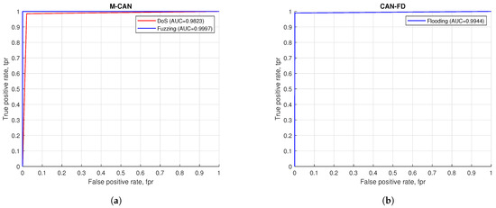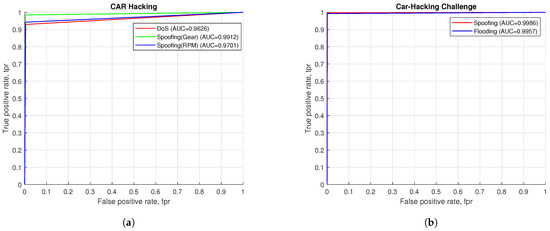F1-score, a measure of the classifier reliability and its effectiveness in making class-wise predictions, is measured using Equation (10), and the calculated results are presented in Table 5. Normally, a scale of 0–1 is used for the efficiency measurement of F1-score: the closer the value is to one, the better the performance, and vice versa. Satisfying the classifier performance, the F1-score for all the attack designs and datasets is almost one in the range of 0.95541–0.99961 with a maximum and minimum absolute errors of 0.04459 and 0.00039, respectively. Analyzing the datasets, Datasets 2, 4, 5, and 6 performed exceptionally well with the highest F1-scores of 0.99857, 0.99844, 0.99961, and 0.99488, respectively. However, Datasets 1 and 3 also showed remarkable performance with the lowest values of 0.96073 and 0.95541. Attack-wise analysis showed that the best results were obtained for fuzzy attacks (Absolute Error: 0.00156–0.00039), followed by spoofing attacks (Absolute Error: 0.02949–0.00143), DoS attacks (Absolute Error: 0.03927–0.00219), and flooding attacks (Absolute Error: 0.04459–0.00375). F1-score for the malfunction and impersonation attacks in Datasets 3 and 4 is also apprehendable, showing values of 0.98432 and 0.99844, respectively. Summarizing, the proposed classifier is highly reliable in attack classification and detection for the imbalanced datasets. Note that all the datasets considered are imbalanced as the sample size for attacked and normal data is different.