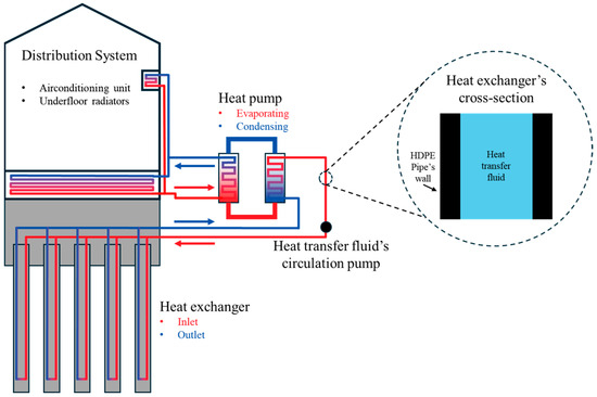 GSHP systems are widely recognized for their efficiency and sustainability in heating and cooling space by taking advantage of the relatively stable ground temperatures throughout the year. These systems work by using the ground as a heat source in the winter and a heat sink in the summer, which is achieved by circulating a heat transfer fluid through a network of heat exchangers embedded in the ground [12,13].