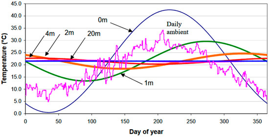 The temperature of the ambient air and the upper portion of the ground, “vadose zone” fluctuates in a sinusoidal pattern as shown in Figure 2 [17], influenced by daily air temperature cycles, solar radiation, and seasonal variations. However, at depths of 9 to 12 m, the ambient soil temperature remains relatively stable throughout the year [18]. The highest soil temperatures occur in summer and the lowest in winter, with a slight lag compared to air temperatures due to seasonal passive cooling and heating effects.