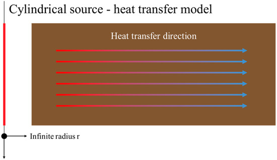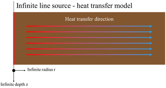 The Infinite Line Source (ILS) model is the simplest model for analyzing heat transfer in the ground, assuming an infinite length, uniform temperature heat source. Figure 4 illustrates the ILS assumption. This model is suitable for short-term analysis, ranging from hours to days, and for initial design estimates. The model relies on a time-dependent solution based on pure conduction heat transfer, assuming continuous and spontaneous heat generation from time zero. This concept, often referred to as the Kelvin line source theory, is attributed to the work of Lord Kelvin [32,33].