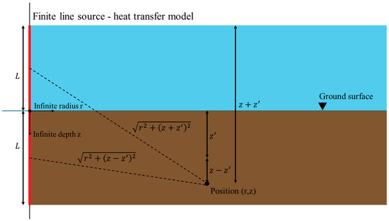 The heat source of finite length, , dissipates heat into the surrounding ground. The advantage of this model is that it considers the effect of changing air temperatures by assuming the ground surface as a reflection plane.