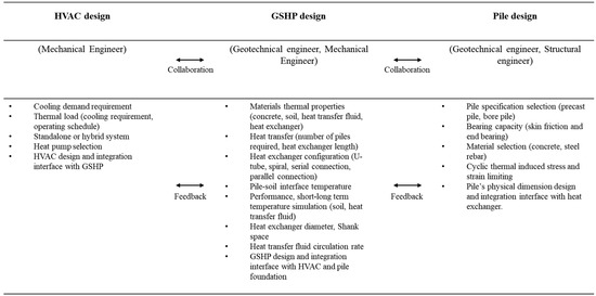 The design of the GSHP system can be performed by either geotechnical or mechanical engineers. Key considerations include selecting materials for GSHP components with appropriate thermal properties, such as concrete, soil, and heat transfer fluids. Important decisions also involve practical design details, such as the number and length of piles required to meet the HVAC team’s thermal load specifications, the heat exchanger configuration (e.g., U-tube, spiral), the physical size of the heat exchanger, the flow rate of the heat transfer fluid, and the operating temperature limits to prevent thermal saturation of the soil. These parameters are determined based on both short-term and long-term soil temperature and pile–soil interface conditions. In addition, feedback on the GSHP operating schedule may need to be communicated back to the HVAC design team. Integration of the GSHP design with HVAC systems and pile foundations is a critical aspect that requires coordination and agreement among all parties involved.