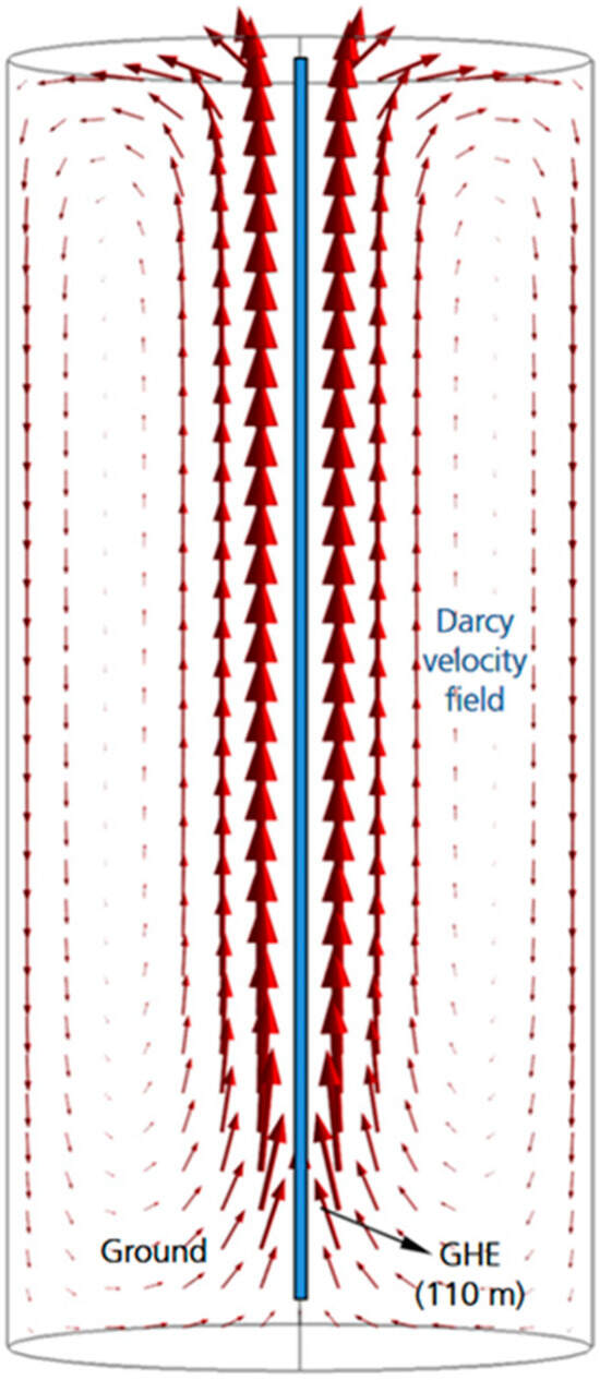 This approach effectively models heat transfer problems by treating the heat exchanger as a heat source within a larger computational domain over a reference time period (). Under steady-state conditions, this function can be used to calculate the long-term performance of the embedded heat exchanger and the overall GSHP system.