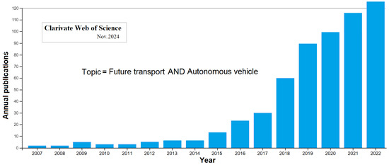 Transportation planning is an engineering field with a very long history [1]. In the past 10–15 years, autonomous vehicles (AVs) have acquired a game-changing role in the visions of future transport development [2,3,4,5,6]. Figure 1 illustrates the rapid growth in the number of scientific publications that discuss the application of AVs in solving future transportation issues.
