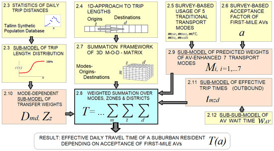 In this work, a practical, complete model of transport times affected by AVs is proposed, which comprehensively allows model users to reach from a set of transparently defined input data with minimal necessary volume to a concise output, which is the effective daily travel time EDTT of an average suburban resident. The model takes into account, either precisely or simplified, most of the important mechanisms that shape the impact of AVs in the role of first-mile vehicles.It should be emphasized that, following the compact modeling methodology, in order to preserve the model’s predictive power and generality, the inclusion of overly detailed sub-models has been deliberately avoided, and only the most important aspects that affect EDTT have been taken into account. Thus, the paper focuses on the formulation of the mathematical computational system rather than the details of the system components (submodels), for which many high-level detailed publications are available.