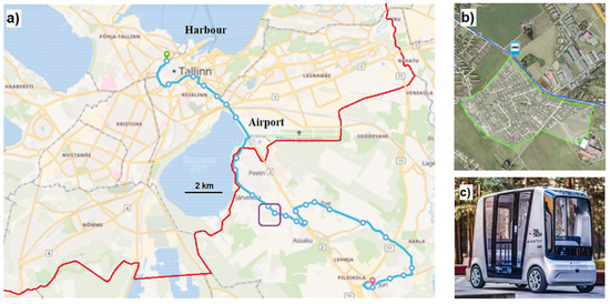 In 2022, a pilot project of future transport was initiated by the Finest Centre of Smart Cities at Tallinn University of Technology [28,29,30,31] in order to test the applicability of ISEAUTO autonomous minibuses on the first-/last-mile section connecting the suburban residential region Järveküla with Tallinn Harbour (see Figure 3a below). The real spatial situation of the task and initial version of the developed autonomous minibuses are illustrated in Figure 3 below.