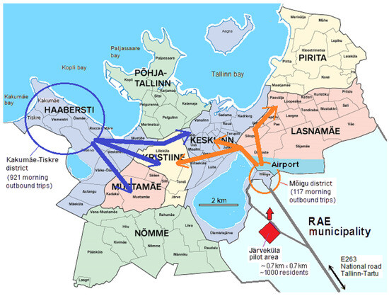 Due to the lack of detailed trip length data for the suburban residential area of Järveküla, in this study, we have applied the hypothesis of the similarity of the trip length distribution functions with the remote private housing districts within Tallinn city borders. Reliable distribution functions can be constructed on the basis of the available detailed database of the daily movements of the Tallinn synthetic population database [36]. Figure 4 presents the two depicted example areas within Tallinn city limits (Mõigu and Kakumäe-Tiskre), which could be similar to the residential area of Järveküla (red rectangle in Figure 4) in terms of percentage of private housing and residents’ movement profiles.
