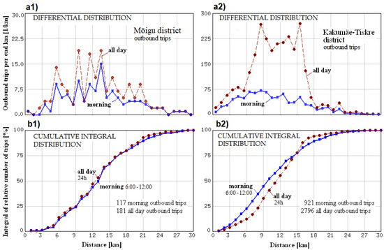 Summary of trip distance statistics of daily outbound trips for two example residential areas of Tallinn city on basis of the synthetic population database of Tallinn: (a1) Differential distributions with 1 km step for Mõigu area; (b1) The integrated cumulative distributions for Mõigu area; (a2) Differential distributions with 1 km step for Kakumäe-Tiskre area; (b2) The integrated cumulative distributions for Kakumäe-Tiskre area.