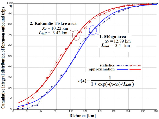Figure 6 shows the result of RMS (Root Mean Square) fitting of statistics of morning outbound trips of Figure 5 by the 2-parameter sigmoid curves (1) for districts of Mõigu and Kakumäe-Tiskre. The results show that the median path length of established morning journeys for Tallinn residents is between 10 and 13 km, and the willingness to choose more distant places of work and study decreases exponentially with a characteristic path length of 3.4 km. The greater median distance for the Mõigu district may be explained by the airport, which separates the settlement of Mõigu further from schools, shopping centers and workplaces.