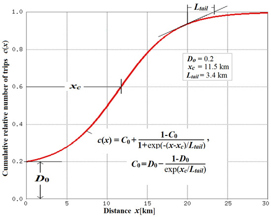 Figure 7 summarizes the constructed 3-parameter distribution function used below in the present study to describe both the contribution of local trips and the distribution of lengthier trips over longer distances provided by private cars, taxis, and public transport buses.
