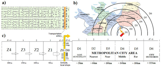 One-dimensional distances-based spatial model of transportation task: (a) an abstract map of residential area housing with local institutions, transport artery, and public transport stops on one edge; (b) distances-based concept of destination districts in metropolitan areas; (c) the simplified one-dimensional spatial scheme of origin zones and destination districts.