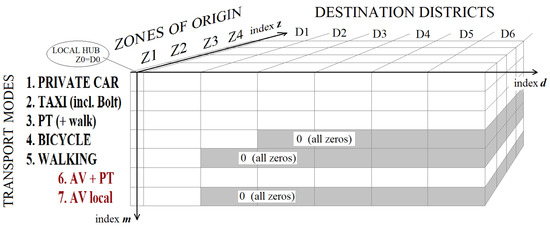 The application of two-dimensional origin-destination (OD) matrices is a well-known methodology in transportation research; see, for example, [40]. In the present study, it is necessary to add a third dimension of transport modality to account for changes in proportions between transport modes due to the availability of AVs. The formal three-dimensional framework of the modality-origin-destination matrix is explained by Figure 9 below.