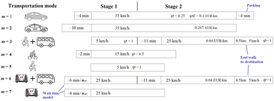 - m is the index of the transportation mode (values 1–7, see Figure 9),