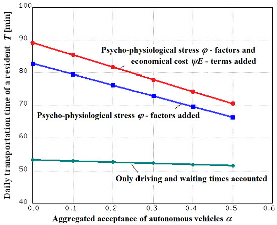 Furthermore, the results from Figure 12 show that including in the calculation the -terms of perceived financial cost increases the positive effect of implementing AVs, but not as much as adding the -terms of psycho-physiological stress to the pure waiting and driving times.