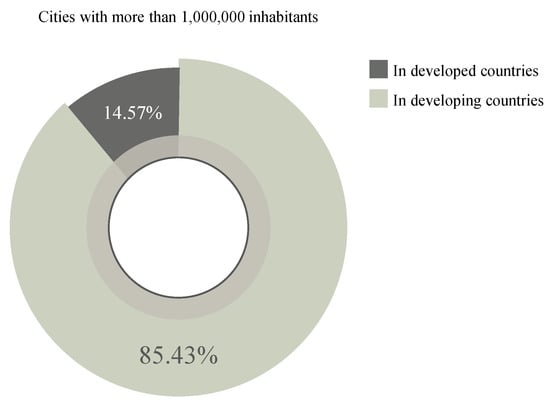 According to the United Nations [1], 56% of the global population currently lives in cities, a figure expected to increase to 68% by 2030 [2]. Although cities occupy only 3% of the available surface on Earth [3], they are responsible for 70% of carbon emissions [4]. Rapid growth in cities has often outpaced their ability to meet the needs of their residents. In 1950, only 83 cities had more than one million inhabitants, mainly in developed countries; today, 508 cities have this population and are located primarily in developing countries [2], representing the most significant urban growth, as shown in Figure 1.
