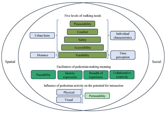 Regarding walking, the most extended mode in AM, Alonzo [41] provides a framework to understand how socio-spatial factors affect walking and hierarchize it as shown in Figure 2. This theory describes how walking is affected by urban form and limits. These are five and appear ordered ascendingly, with I being the most essential consideration and scaling to V, the last factor considered. However, all levels could determine whether to walk or not.
