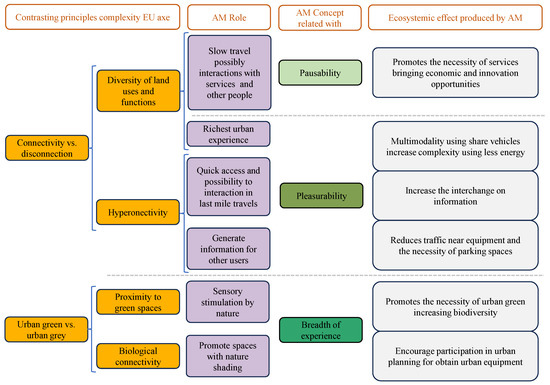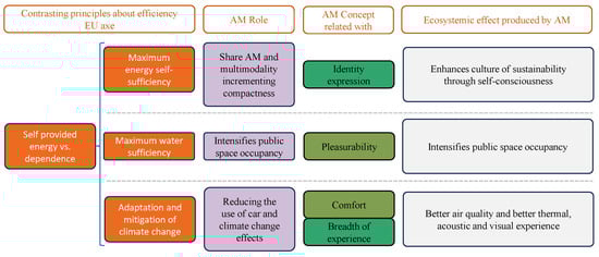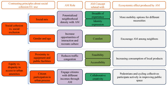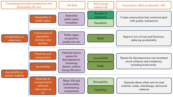 The EU represents an urban model for achieving sustainability through its four axes. This model claims the recognition that urban environments are complex ecosystems where the interaction among nature, urban amenities, and human activities shapes the city and affects the wealth of its citizens. In this sense, AM must play a transformative role in the EU by promoting new habits and transportation possibilities. Encouraging cities to walk and cycle could create synergies to generate virtuous cycle results. Also, by understanding its interdependence, we can elucidate effective strategies. Next, each EU axis is contrasted with each aspect of AM, social and spatial, searching for roles and effects.