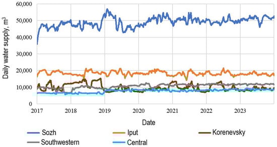 The structure of the studied water supply system includes five main water intakes: Sozh, Iput, Korenevsky, Southwest, and Central, which supply water resources to both the population and industry of the city. The water supply sources operate in a common hydraulic system, maintaining established technological water parameters for consumers. Each of the water intakes is located in different parts of the City and has unique characteristics in terms of both capacity and pressure levels. Figure 1 shows the dynamics of water delivery volumes by day for each of the intakes in the study system. To construct the time diagram, the data were smoothed using the moving average method, which allowed for the reduction of the influence of short-term fluctuations and better reflects the main trends in the dynamics of water supply during visual analysis.