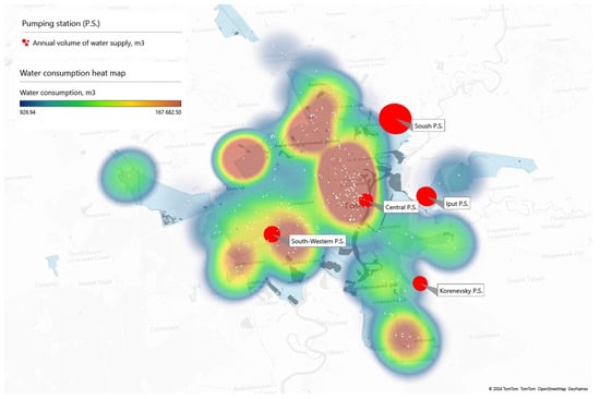 Step 3: Aggregation of data by address. To reduce computational costs, the aggregation of water consumption data at the house and street level is performed. This step allows us to combine information about several consumers located in the same building, preserving key consumption indicators while reducing the total amount of data. If the data structure includes not only industrial users but also residential customers, it is useful to aggregate the data by bringing the indicators from apartment metering to individual houses or neighbourhoods in order to obtain a generalised picture of water consumption. Aggregated data are used for visual analysis when constructing a heat map of water consumption and assessing its distribution over the city territory, which provides a more visual representation of the distribution of load on the water supply system and remoteness from water intakes. For the system under study, the heat map (Figure 2) visually represents areas with high water demand (red areas) and areas with moderate and low consumption (green and blue areas, respectively).