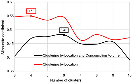 Here, the silhouette coefficient was calculated as the difference between the intra-cluster distance and the inter-cluster distance normalised by the maximum of these two distances. High values of the coefficient, closer to 1, indicated good clustering and separation efficiency of the data. It is worth noting that understanding the most effective structure of the separation of water consumption objects on the map allows for the adaptation of the management of water withdrawals to real water demands [32,33]. At the same time, the efficiency of clustering and the possibility of changing the boundaries of clusters in real time directly depend on the automation of the water supply system in terms of obtaining operational information about the levels of water consumption in the city. The integration of spatial analysis into water consumption management requires the use of modern technologies for data collection and processing [34].