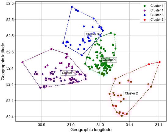 According to the obtained clusters, the water consumption objects were plotted on a coordinate grid, which allowed visualising groups of consumers by their geographical location. To draw the boundaries, the convex hull algorithm from the ConvexHull class of the SciPy library was used to connect the points defining the outer boundaries. This approach clearly marked the territorial boundaries of the clusters (Figure 6). It should be noted that the allocation of four clusters turned out to be justified not only from the point of view of spatial optimality of their location on the map, but also from the point of view of the boundaries of the pipeline network service areas. For example, cluster No. 1, which is located near the Southwest water intake, is predominantly situated in the south-western part of the city of Gomel and covers residential and industrial areas of the Sovetsky district with socially developed infrastructure. The classification of water consumers is distinguished by an increased number of health care and educational institutions, indicating the active use of the selected zone for both residential and industrial needs. This group included 27.4% of the total number of water consumers considered.