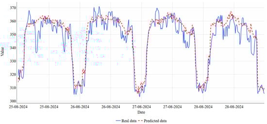 The ultimate goal of this research is to develop a hydraulic modelling system for Gomel’s water supply. For this purpose, an IoT platform for pressure monitoring based on the Internet of Things technology is being developed. The platform organises data exchange using the MQTT protocol, which allows for the efficient collection and transmission of information from pressure sensors. This also opens up opportunities for research and the development of more accurate prediction models based on neural networks. Figure 8 shows the pressure model of one of the control points in the city network and its actual pressure. The data on the pressure at the pumping stations of the investigated water intakes are used as input parameters. Output parameters are presented as pressures in the control points of the system.