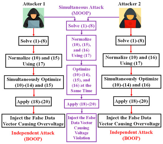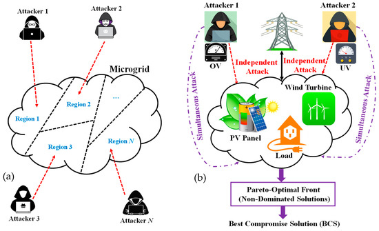 The developed multi-objective framework is illustrated in Figure 1. According to Figure 1a, a typical smart microgrid can be targeted by N attackers to significantly enhance the negative impacts of the unified attack framework; however, for the sake of clarity as well as elaborating the idea, Figure 1b only includes two attackers. From Figure 1b, it can be inferred that Attacker 1 targets the microgrid, which can be operated in both grid-connected and standalone modalities, via a FDIA resulting in overvoltage (OV) at the most vulnerable time. In addition, Attacker 2 in another independent cyberattack targets the microgrid to cause undervoltage (UV) at the optimal time. It is noted that these two cyberattacks are designed as bi-objective optimization problems (BOOPs) to obtain a set of optimal solutions instead of one unique solution. The objective functions of these two BOOPs include (a) maximizing the rate of overvoltage/undervoltage in the microgrid and (b) minimizing the amount of false data (to be injected to the system) to ensure the intended rates of voltage violation. This is to ensure that the attackers can maximize the voltage violation while the injected false data vectors remain small enough. The results of these two attacks might not necessarily affect each other since (a) the objective functions are not in accord with each other and (b) the optimal time of the FDIAs may be different.