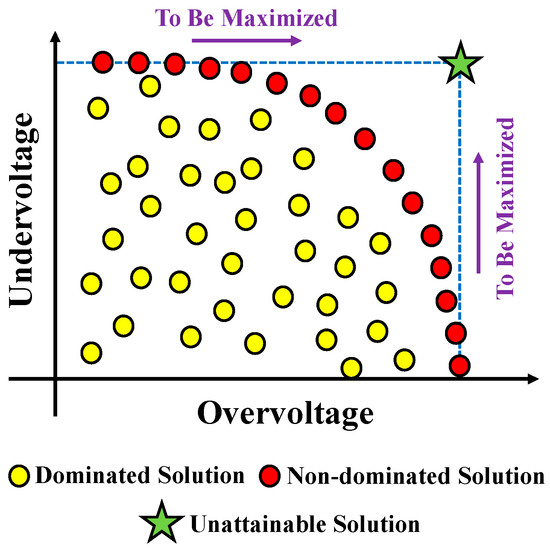 The developed coordinated FDIA resulting in both overvoltage and undervoltage at the same time needs to be solved as an MOOP with three objective functions. The first objective function is to maximize the overvoltage (i.e., Equation (15)), the second objective function maximizes the undervoltage (i.e., Equation (16)), and the third objective function ensures the false data vectors to be injected into load centers and generation units are small enough to prevent any violation in the rated values (i.e., Equation (10)). Therefore, the developed FDIA has three dimensions; however, as an illustration, Figure 2 demonstrates the Pareto-front associated with maximizing the main objective functions of this problem (i.e., Equations (15)–(16)) to facilitate capturing the idea. More information about the 2D and 3D Pareto-optimal fronts will be provided in Section 3.2.