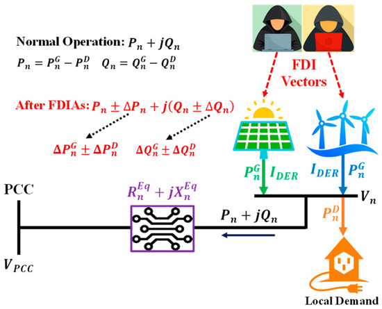 From Equation (9), it can be gathered that injecting false data (e.g., ΔPn and ΔQn) to the net powers associated with node n (i.e., Pn and Qn) results in different rates of violation in the voltage magnitude of node n. In other words, any positive or negative values of ΔPn and ΔQn will result in different rates of deviation in both forms of overvoltage and undervoltage (see Figure 3). However, attackers need to ensure that the amount of false data injected into both load centers and generation units installed on each node will not trigger the security systems [16,17,18]. Toward this end, Equation (10) presents the developed optimization problem that needs to be solved by attackers to recognize the minimum false data vectors to be injected into the microgrid’s control center. It is noted that the optimization problem presented in Equation (10) should be solved subject to satisfying Equations (2)–(8) to meet the technical constraints of the microgrid as well as Equations (11)–(14) to ensure that the cyberattacks do not violate the rated values.