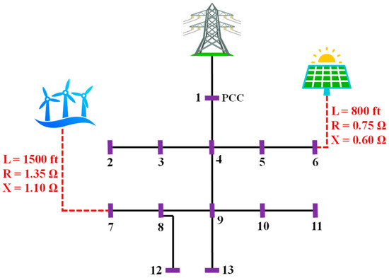 To evaluate the effectiveness of the developed multi-objective FDIA, two different case studies are implemented. In the simulation analysis, the modified version of the IEEE 13-node test feeder (see Figure 6) is utilized as a microgrid to highlight the impacts of the unified cyberattack on its voltage profile. To this end, a PV plant with a capacity of 200 kW is added to node #6. In addition, a wind turbine, manufactured by Wind World [27], with a rated power of 250 kW and blade diameter of 29.2 m is added to node #7. It is noted that the solar irradiance at standard test conditions and the operating irradiance point are, respectively, equal to 1000 W/m2 and 120 W/m2.