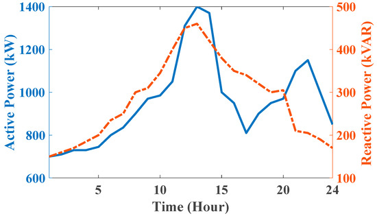 It is also noted that the hourly active and reactive power profiles in a 24 h horizon are adopted from [28,29], which are depicted in Figure 7. The rest of the system’s data can be found in [30,31].