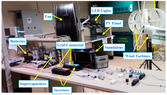 The lab-scale microgrid developed in the first step of this research (see Figure 8) is chosen for the experimental analysis [32,33]. According to Figure 8, one can perceive that the lab-scale microgrid encompasses two horizontal axis and vertical axis wind turbines, respectively, rated at 500 W and 400 W, two 160 W solar panels, a fan with 19,500 cubic feet per minute (CFM) airflow to produce wind in the lab, four 2200 W LED lights to produce solar radiation in the lab, two grid-connected power inverters rated at 500 W, one standalone inverter and its controller rated at 2000 W, a hybrid energy storage system (i.e., a combination of batteries and supercapacitors), and the corresponding buses, switches, and charge controllers. Interested readers are directed to the earlier steps of this research to obtain detailed information about the lab-scale microgrid and its assets [32,33].