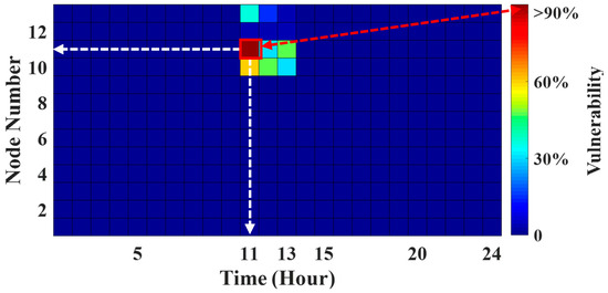The main goal of the pre-attack evaluation is to recognize the most vulnerable node to deviation in voltage as well as the optimal time of the FDIAs. In this regard, attackers solve Equations (1)–(8), aiming at increasing the voltage deviation in the microgrid. The difference between the original voltage profile and the one obtained by the attackers is provided in Figure 10. According to this figure, one can infer that only nodes #10, #11, and #13 from 11 AM to 1 PM are susceptible to voltage deviation. However, the pre-attack evaluation confirms that node #11 is the most vulnerable node in IEEE 13-node test systems and the optimal time of the cyberattacks is 11 AM (see Figure 10).