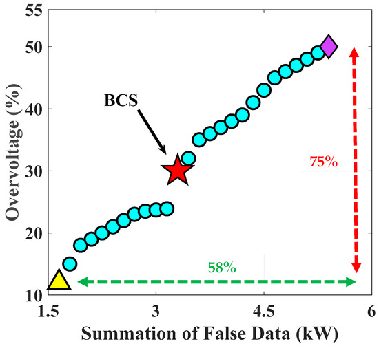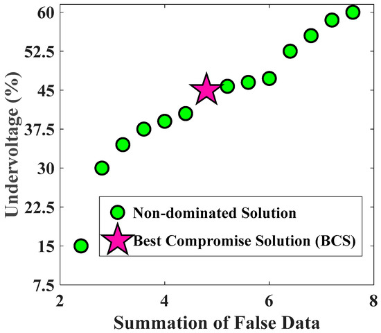 Simultaneously optimizing objective Functions (10) and (15), Attacker 1 identifies the non-dominated solutions as shown in Figure 11, causing different rates of overvoltage in the microgrid. From Figure 11, it can be perceived that the Pareto-optimal front is well distributed; hence, Attacker 1 can select one of these optimal solutions (e.g., the cyan circles) and inject the corresponding false data vector to the load centers and generation units to push the microgrid toward overvoltage. As an illustration, if Attacker 1 selects the yellow triangle, the summation of false data injected into the system will be minimal; however, the rate of overvoltage will be minimal, as well. If the attacker opts for the purple diamond, although the rate of overvoltage will be maximal, the summation of false data to be injected to the system will also be maximal. This is where the significance of approaching this problem as a BOOP comes under the spotlight. Thus, if the importance of both objective functions is equal, Attacker 1 sets ξk to 0.5 (see (20)) to find the best compromise solution (BCS), as demonstrated by the red pentagram in Figure 11. It is worth stating that the percentage of conflict between the objective functions (i.e., yellow triangle and purple diamond) is almost 95%, which is obtained by applying the Pythagorean Theorem (see Figure 11).