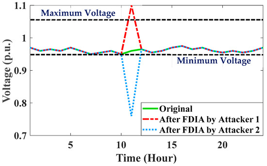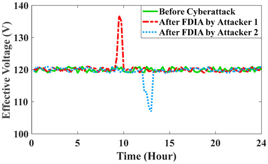 To highlight the impacts of the unified FDIA targeting both renewable-based DERs (i.e., PV panel and wind turbine), Figure 17 illustrates the voltage profile of the targeted microgrid (black solid curve) compared to the original voltage profile (i.e., green dashed curve) as well as those obtained after the independent cyberattacks (i.e., Figure 15). From Figure 17, one can perceive that when the microgrid is targeted by a unified cyberattack causing voltage violation (i.e., overvoltage and undervoltage), the system experiences a malicious voltage profile for a longer period (i.e., more than six hours) compared to the time periods at which the microgrid is targeted by two independent FDIAs (see Figure 15).